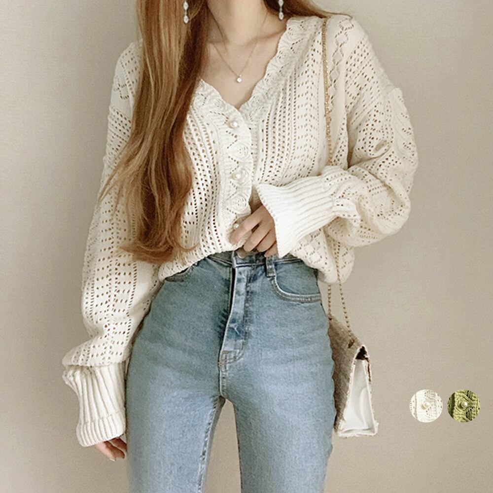 ゆるっとしたシルエットとぽわん袖がトレンド感満載の透かし編みロングスリーブニットカーディガン